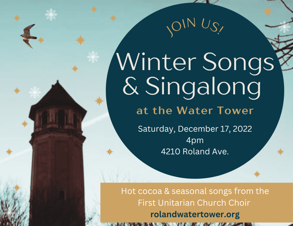 Choir! December 17 at 4pm Posted byRoland Water TowerNovember 14, 2022November 14, 2022Posted inEvents Join us for hot cocoa and seasonal songs from the First Unitarian Church Choir! Saturday, December 17, 2022 at 4pm Share this: Click to share on X (Opens in new window) X Click to share on Facebook (Opens in new window) Facebook Like Loading... Related