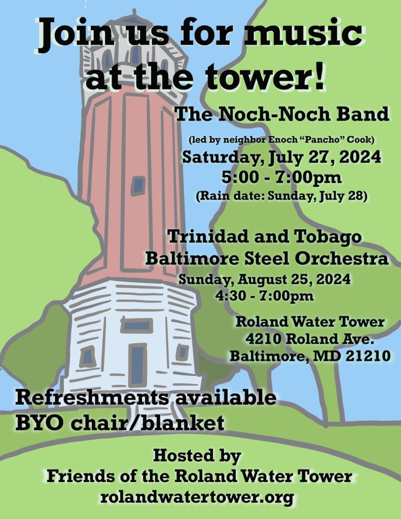 Join us for more music at the tower! Neighbor Enoch “Pancho” Cook and The Noch-Noch Band return on Saturday, July 27, from 5-7pm. BYO chair/blanket and picnic. Hope to see you!