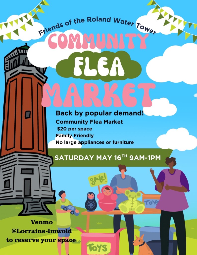 Join us for a community flea market at the Roland Water Tower on Saturday, May 16, 2026! Buy, sell, and chat with neighbors. 9am to 1pm.